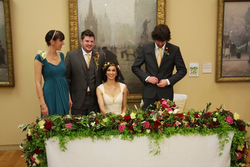 The Registrars table garland incorporated fresh Olive, Smilax, Roses, Orchids, Ranunculas, the colours were rich and vibrant in direct contrast with the paintings