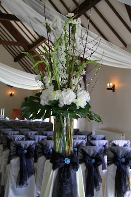 The table designs were huge black martini vases filled with Delphinium, Larkspur, Peonies, Hydrangeas and Gerberas with fountains of Palms spilling over the edges