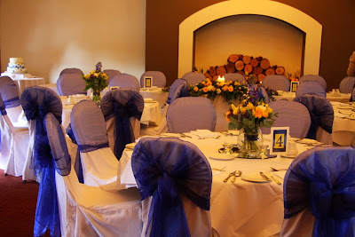 The table centres were hand tied posies of lemon and blue spring flowers